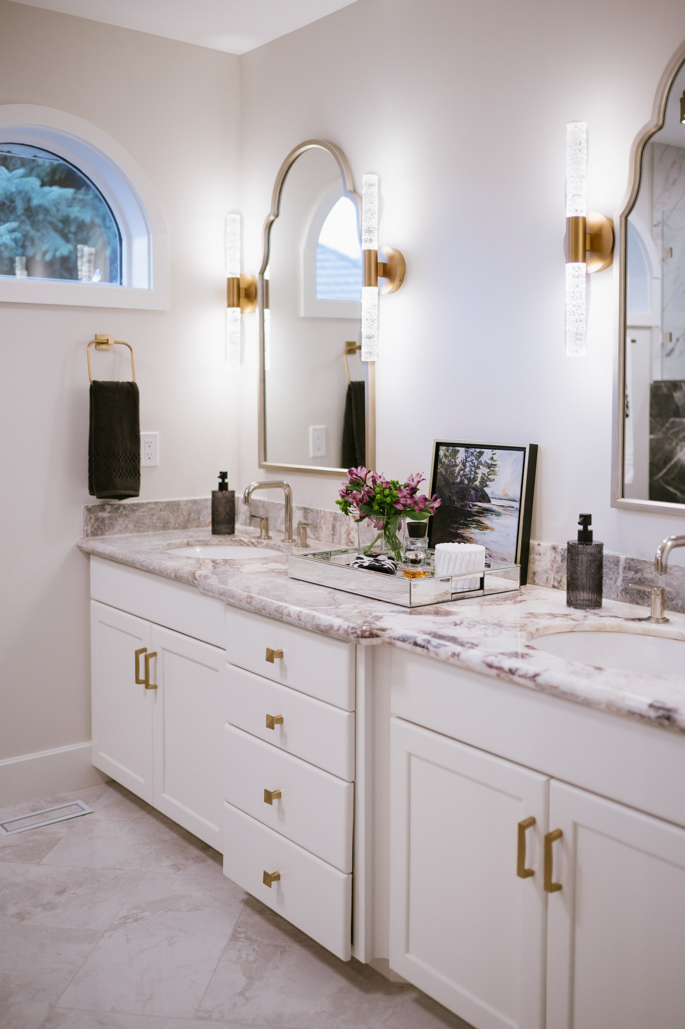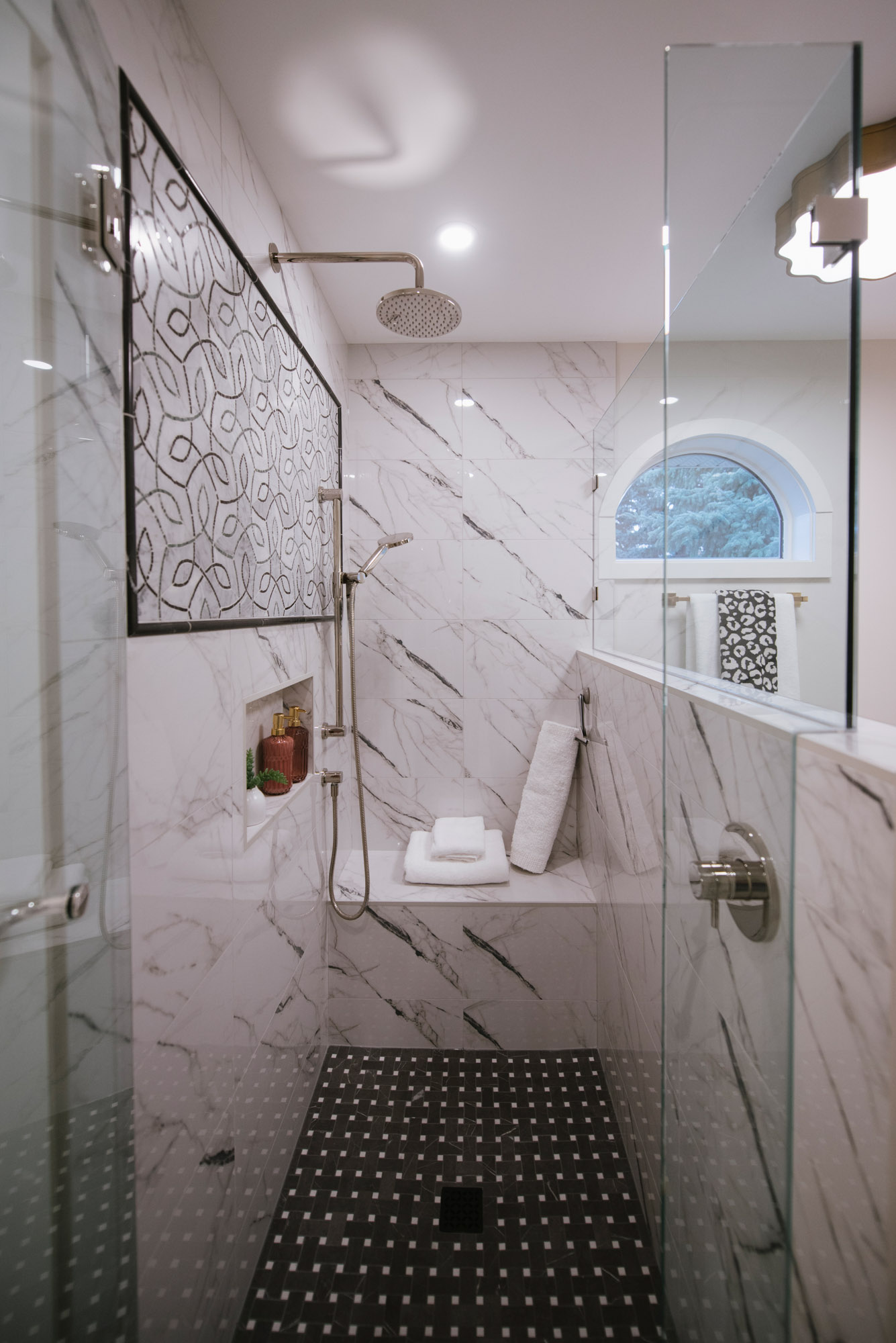 • Kept the steam shower in the lower bathroom but refreshed the tile surround, vanity, lighting, and hardware