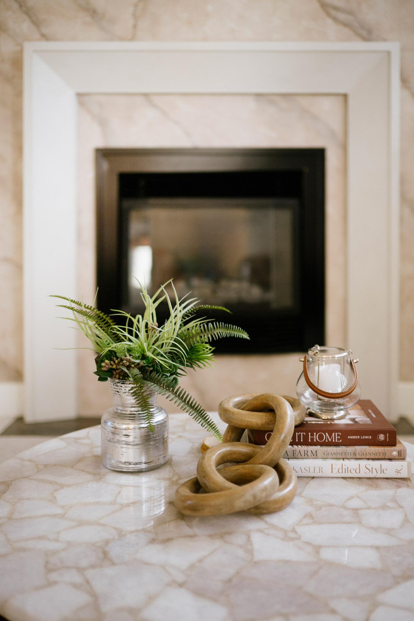 • In the media room, we gave the fireplace a fresh look with a decorative Marmorino plaster finish
