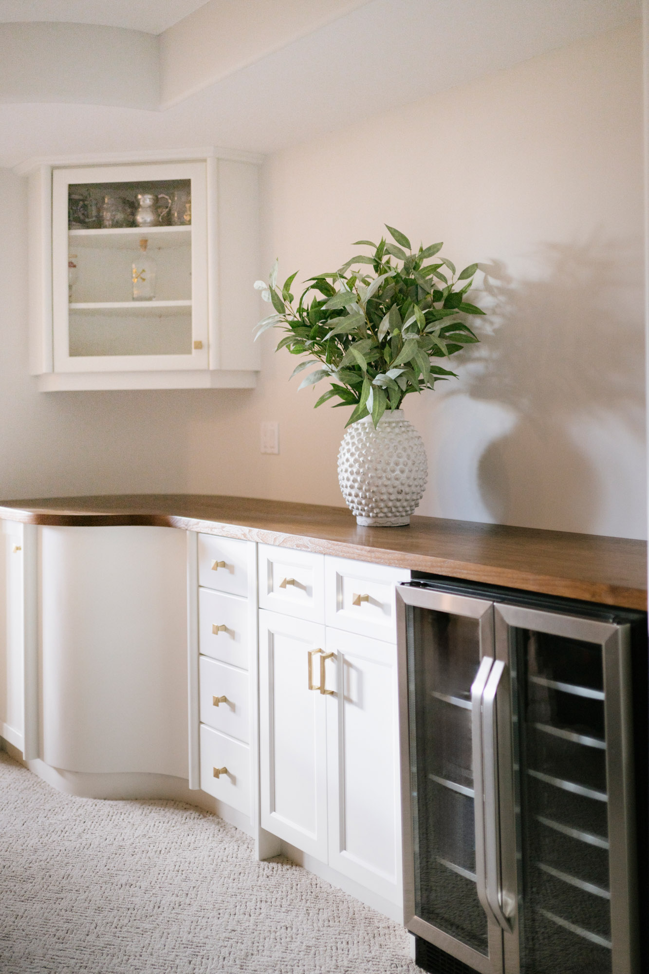 • Removed the oversized media cabinet and added a beverage fridge with painted cabinetry, finished with a dark walnut countertop