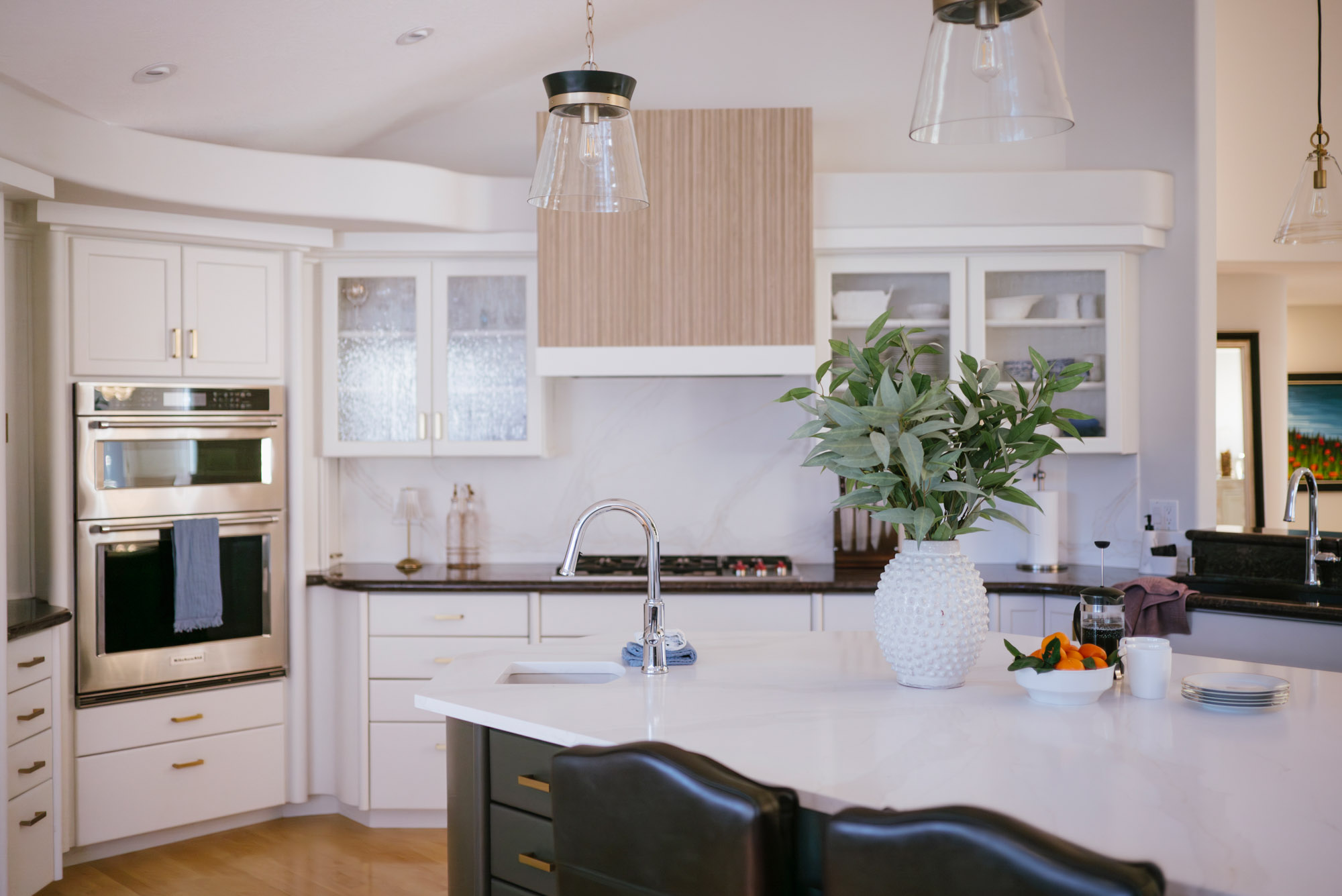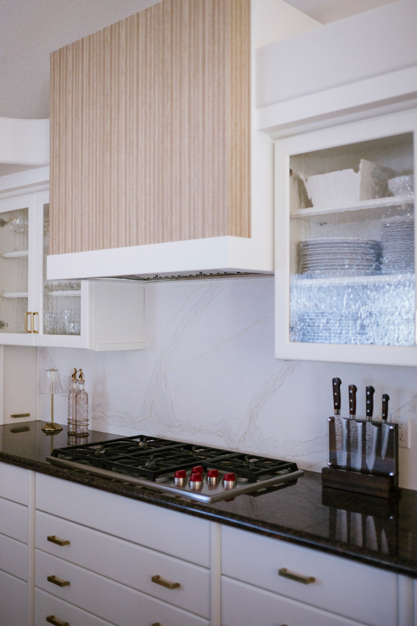 To begin, we removed the glass cabinet above the cooktop and replaced it with a new, custom hood that feels timeless. Then, we swapped the countertops and backsplash for lighter surfaces. The goal throughout was to reduce visual weight and let the kitchen breathe. To finish the space, new cabinet hardware, a stainless sink and faucet, and under-cabinet LED lighting added modern function.