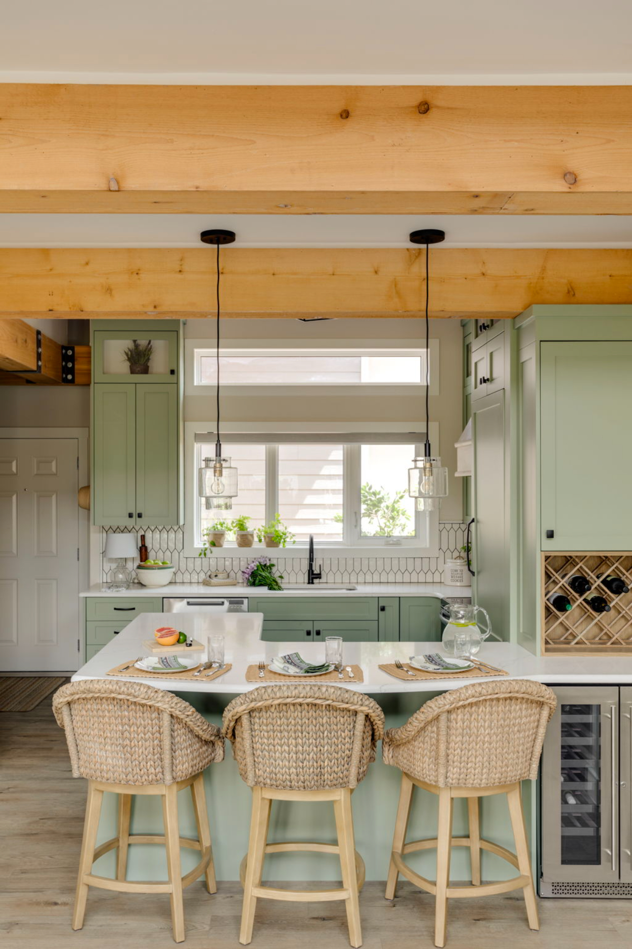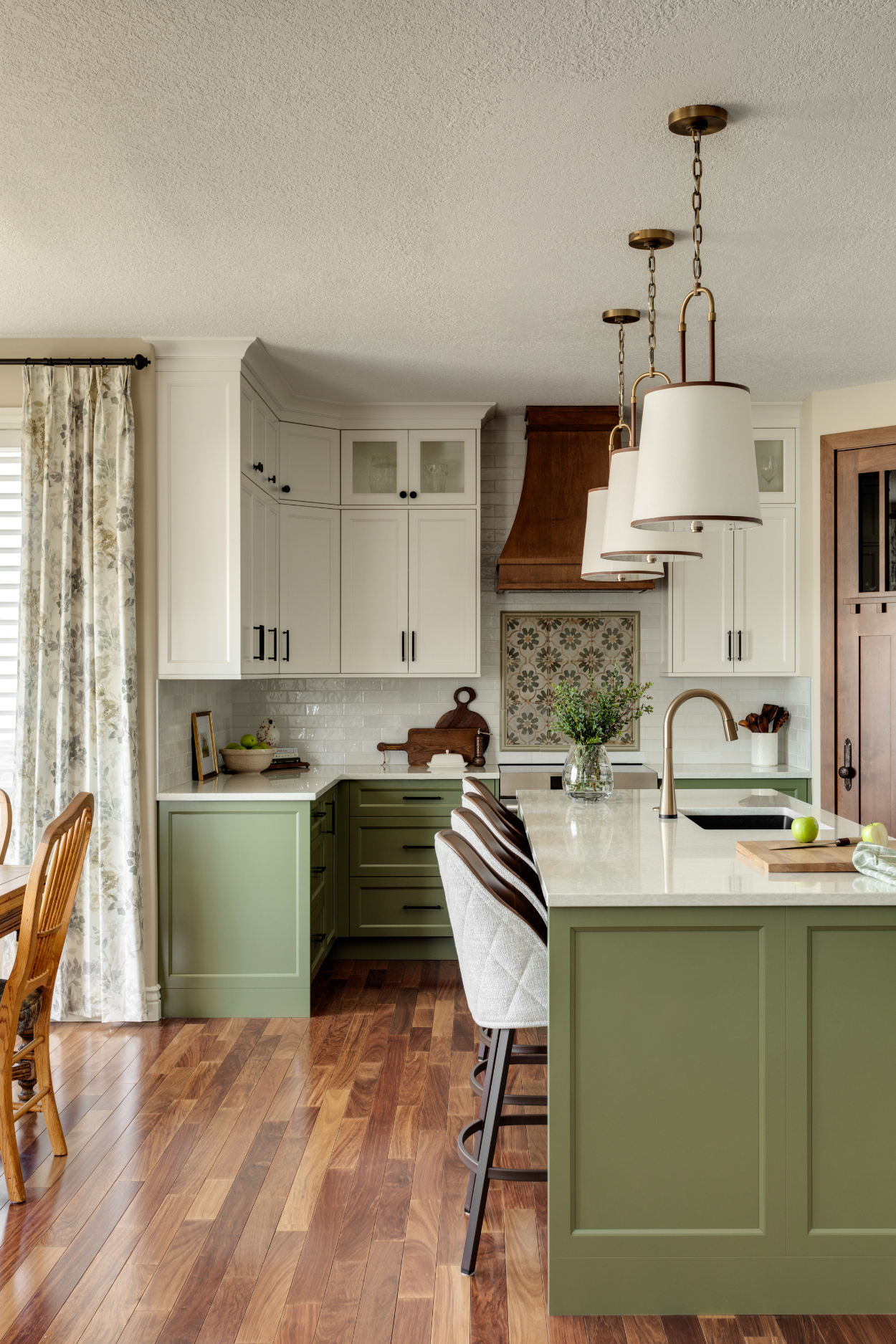 Warm kitchen with green cabinetry, spacious island seating, layered lighting, and open connection to the dining area, designed for comfortable everyday living and easy flow.
